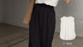 オフホワイトのブラフィールクロップドフェザーキャミソール、ベージュのタックワイドパンツにブラックのシアー半袖シャツジャケットを羽織ったハンサムコーディネート。
