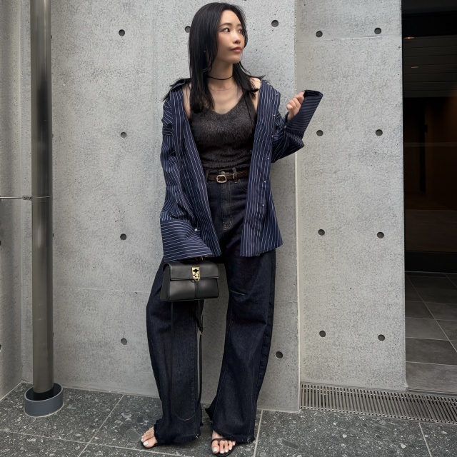 ネイビーのストライプシャツ&デニムパンツ、ダークグレーのブラフィールクロップドフェザーキャミソール、ダークブラウンの細ベルト、ブラックのハンドバッグ&サンダルのメンズライクコーディネート。