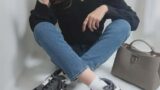 ダークグレーのバギーカーブジーンズと馴染みやすいブラックのヴィンテージベルト&ワイドボストンバッグ&ウォッシャブルニットフラットシューズを合わせる事で、ビスチェ風に巻いた花柄マルチスカーフがより引き立ちます。