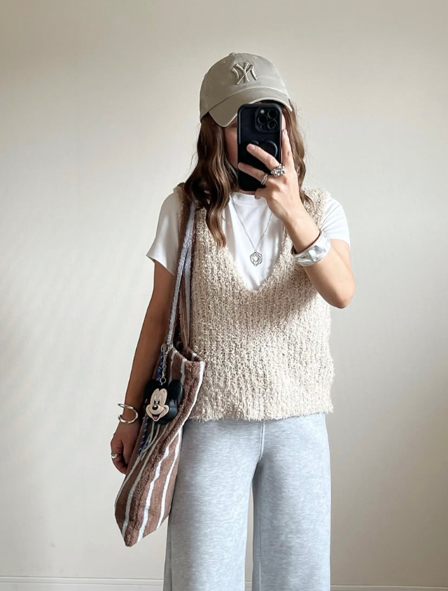 ざっくりした編み目と軽い素材のベストは、まだ少し暑さの残る季節にもピッタリの一枚。