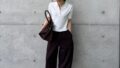 あえて片方の裾だけをインしたコットンシャツのアシンメトリーな着こなしによって、シンプルコーディネートも差が付く仕上がりになります。