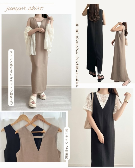 サラリとした合繊素材で冬以外ロングシーズン着回せるジャンパースカートは、前後2WAY仕様となっているのでコストパフォーマンスにも優れたアイテム。