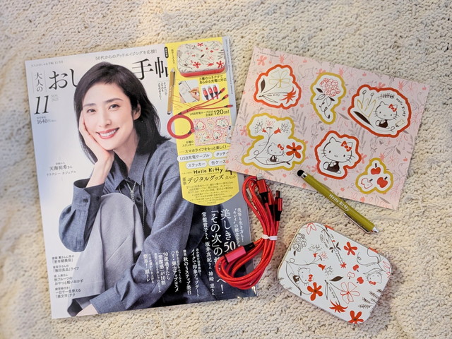 大人のおしゃれ手帖2025年11月号の付録は、マルチケーブルとタッチペン、缶ケース、ステッカーが揃った豪華4点セット!