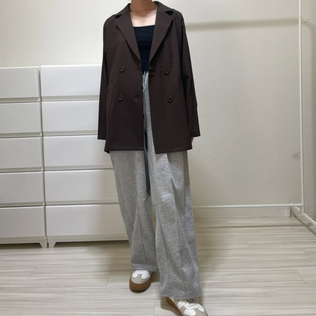 ブラウンのポケット付きテーラードジャケット、ブラックのキャミソール、ライトグレーのスウェットコクーンパンツ、配色スニーカーの大人カジュアルコーディネート。