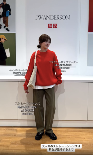 一方、ストレートジーンズは王道のシルエットにくすみグリーンなどの新色が加わり、シックで洗練された印象に。どちらもJW ANDERSONのロゴ入りで、さりげない特別感が魅力。履くだけで旬のバランスを作れる、大人のデイリーボトムです。