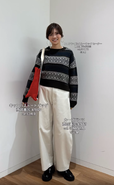 カーブパンツは立体的なシルエットで脚のラインを拾わず、リラックス感がありながらスタイルアップも叶う優れもの。起毛感のある素材が秋冬らしい温かみを演出します。