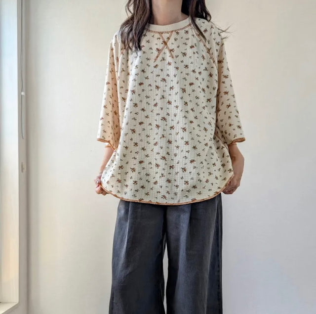 秋にも映える花柄で、ワッフル素材が肌触りの良いトップス。