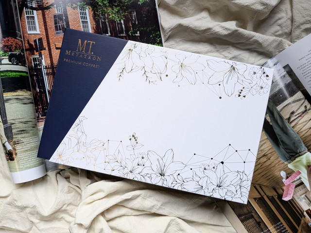 MTメタトロン プレミアムコフレ2025の外箱。白地にフラワーモチーフとネイビーのロゴボックスデザイン