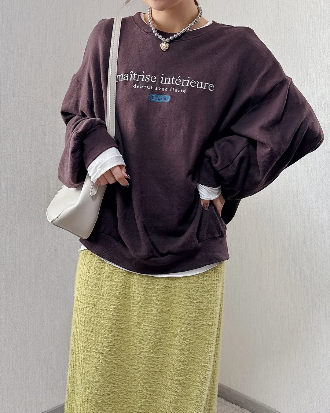 やわらかな裏毛タッチで、長時間着てもストレスがないのがスウェットアイテムの嬉しいポイントです。mako_530さんとしまむらのコラボアイテムであるブラウンカラーのスウェットは、着るだけで季節感がアップ。