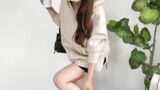 オートミールのTC刺繍プルオーバー、ブラウンのウェーブフリンジスカート、ベージュのブーツの淡色コーディネート。