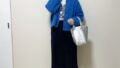 ボリューム袖が可愛いブルーのニットカーディガンを羽織る事で差し色になるだけでなく、見た目にも暖かな印象に仕上がります。