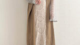 Aラインロングスカートでフェミニンさを取り入れつつ、ウエストのドローストリングデザインでカジュアルさをプラスした装いは、ホワイトの厚底スニーカーで抜け感を忘れずに。