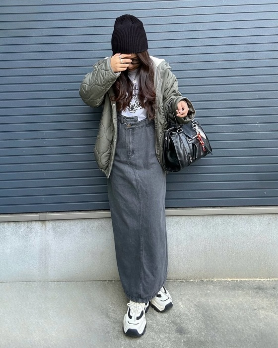 カーキのフードボアキルトブルゾン、ホワイトのタイガープリントTシャツ、ダークグレーのデニムジャンパースカート、ブラックのビーニー&バッグ、モノトーン配色の厚底スニーカーによるカジュアルコーディネート。