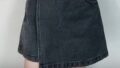 グレーのポロ襟ニットプルオーバー&デニムジャンパースカートのワントーンコーディネートは、カーキのロゴキルティングショルダーバッグとブラックのショートブーツでとことんシックに。