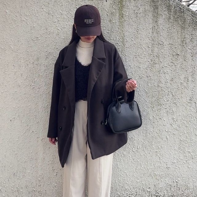 バッグ&スクエアトゥブーツもミドル丈コートと同じブラウンでリンクさせて、大人っぽさと統一感を高めてみて。