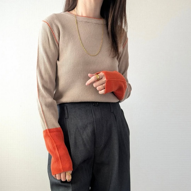 ベージュ×オレンジの「袖配色プルオーバー」を使ったコーディネート