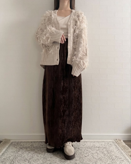 アイボリーのフリンジニットカーディガン&アシンメトリートップス、ダークブラウンの裾メロウプリーツナロースカート、ベージュの厚底スニーカーのスタイルアップコーディネート。