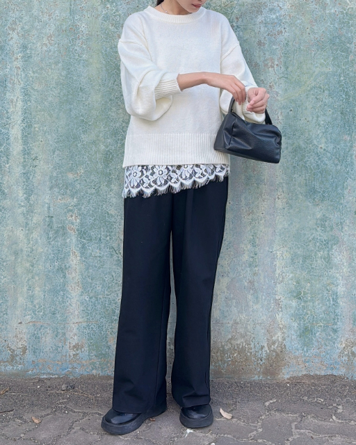 裾からちらりと覗くレースが、コーデに女性らしさをプラスしてくれるレースアイテム。シンプルなニットやスウェットの下に重ねるだけで、手軽にレイヤードスタイルが完成します。