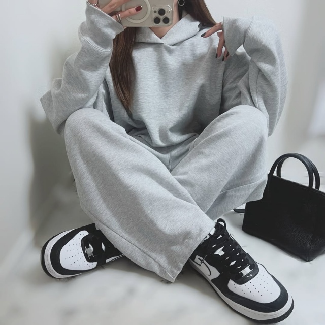 グレーのスウェットオーバーサイズフルジップパーカ&スウェットワイドパンツのセットアップコーディネートは、ストレスフリーな空港コーディネートとしてもオススメ♡