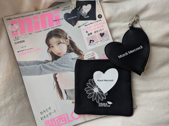 フラットポーチにはハート内に「Mardi Mercredi」ロゴ、横にフラワーアート、「OSAKA」表記が入り、今回の号らしい特別感のある仕上がりになっています。