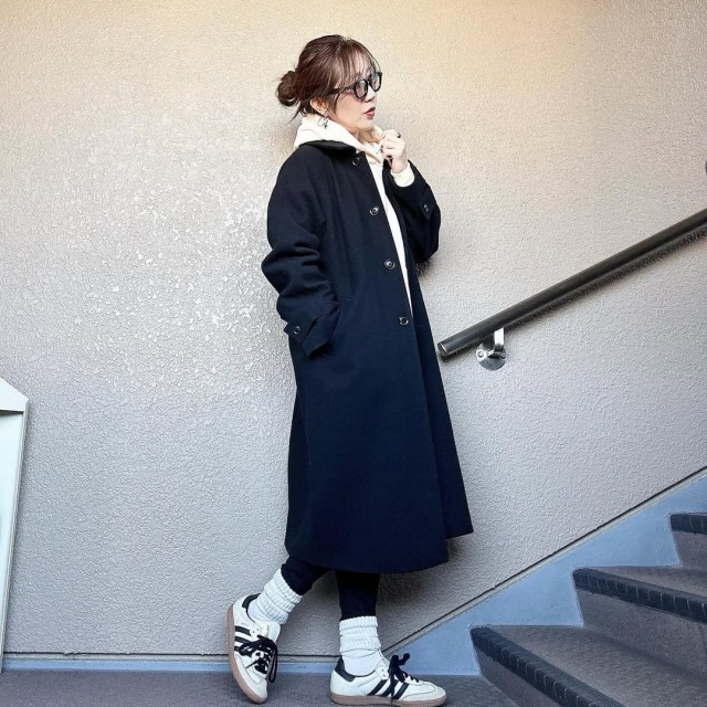 ブラックのコージーメルトンバルマカーンコート&レギンスパンツ、ナチュラルのフィンガーホール付き裏起毛パーカ、ホワイトのルーズソックス&配色スニーカーの大人カジュアルコーディネート。