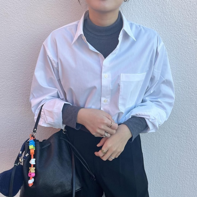 程良いゆとりのあるリラックスシルエットはレイヤードも行いやすく、ブロード素材と好相性なシェル調ボタンが採用されているので、オンオフを問わず着用可能です。