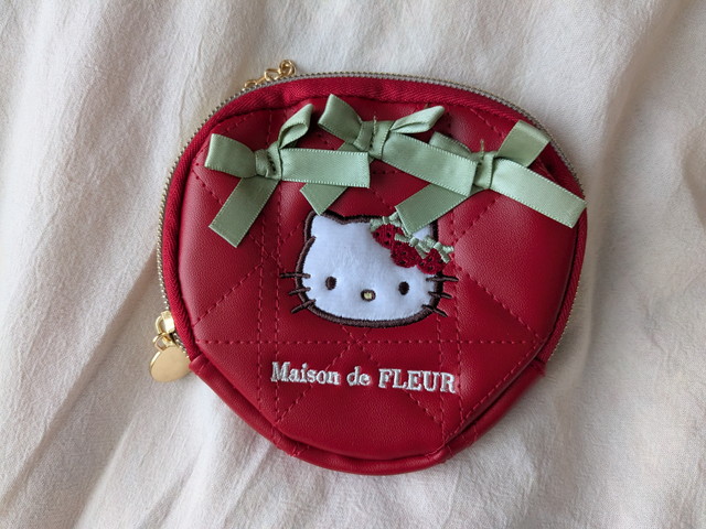 内側はレッドの内張りで統一されており、「HELLO KITTY」のブランドタグがさりげなく縫い付けられています。コンパクトなサイズ感ながら、リップやコインなどの小物をすっきり収納できます。バッグのジッパーにチェーンで付ければチャームとしてもポーチとしても使える2役が嬉しいポイントです。