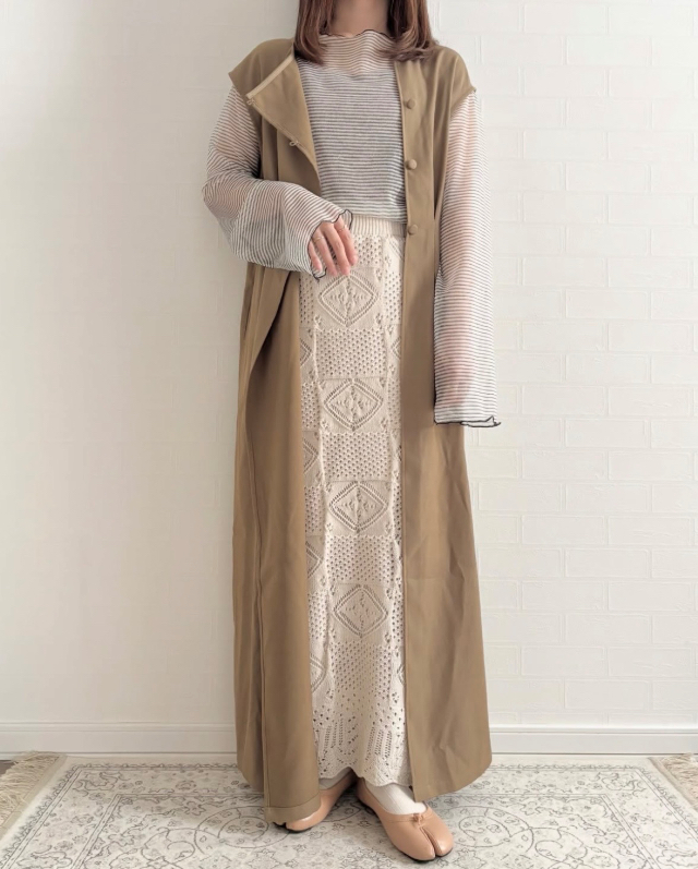 長すぎない着丈はフロントボタンを留める事でプルオーバーとしても着回しやすい上に、パンツとスカートのどちらとも相性が良く、春コーディネートの幅が広がります。