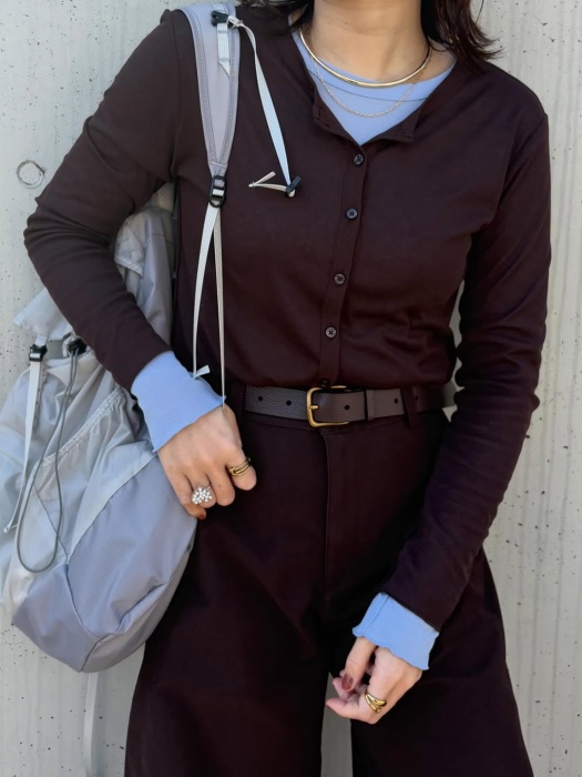 グレー、オフホワイト、ブラック、ピンクから選べ、ボタンを留めてプルオーバーとして着用しても、羽織りや肩掛け、たすき掛けで使ってもサマになるのが嬉しいポイントです。