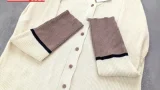 エクリュのフィンガーホールクルーネックカーディガン、ブルーのバレルレッグジーンズ、シルバーのサブバッグ&ポインテッドパンプスによる大人カジュアルコーディネート。