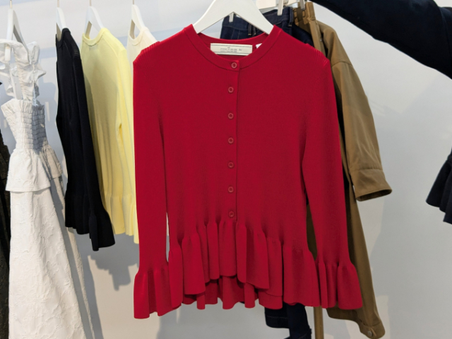 体に程よくフィットする細リブ素材で、自然なスタイルアップが叶う「リブフリルカーディガン」。ウエスト部分のペプラムシルエットがくびれを強調し、女性らしいラインをきれいに引き出してくれます。
